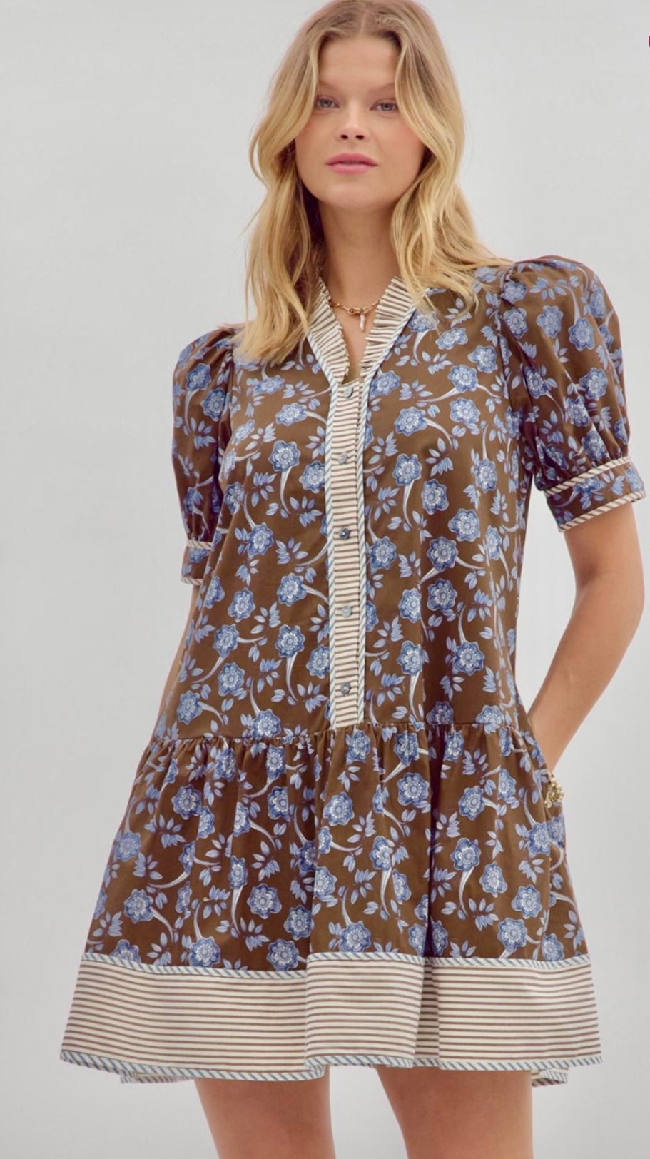 Floral print pleated structured shoulder puff sleeve mini dress featuring contrast striped band hem finish. Ruffle V-neck button front closure. Side Pockets. Lined. Woven. Non-sheer. Lightweight.