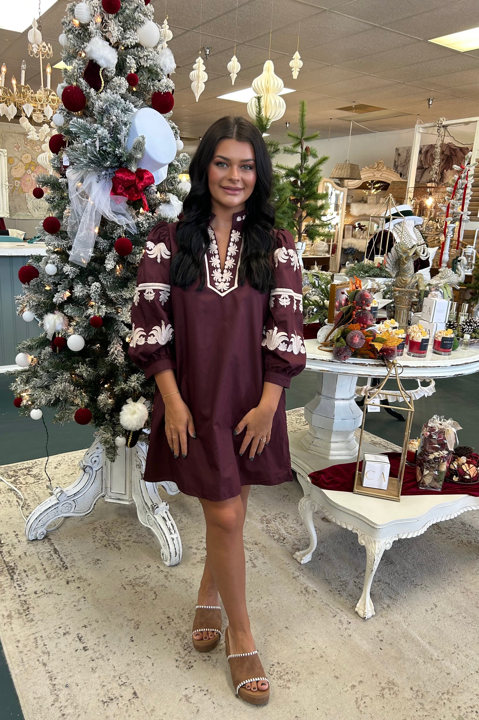 Solid 3/4 puff sleeve mini dress with gathered sleeve openings featuring contrast embroidery along split neckline, collar and sleeves. Side pockets. Lined. Woven. Non-sheer. Lightweight.
