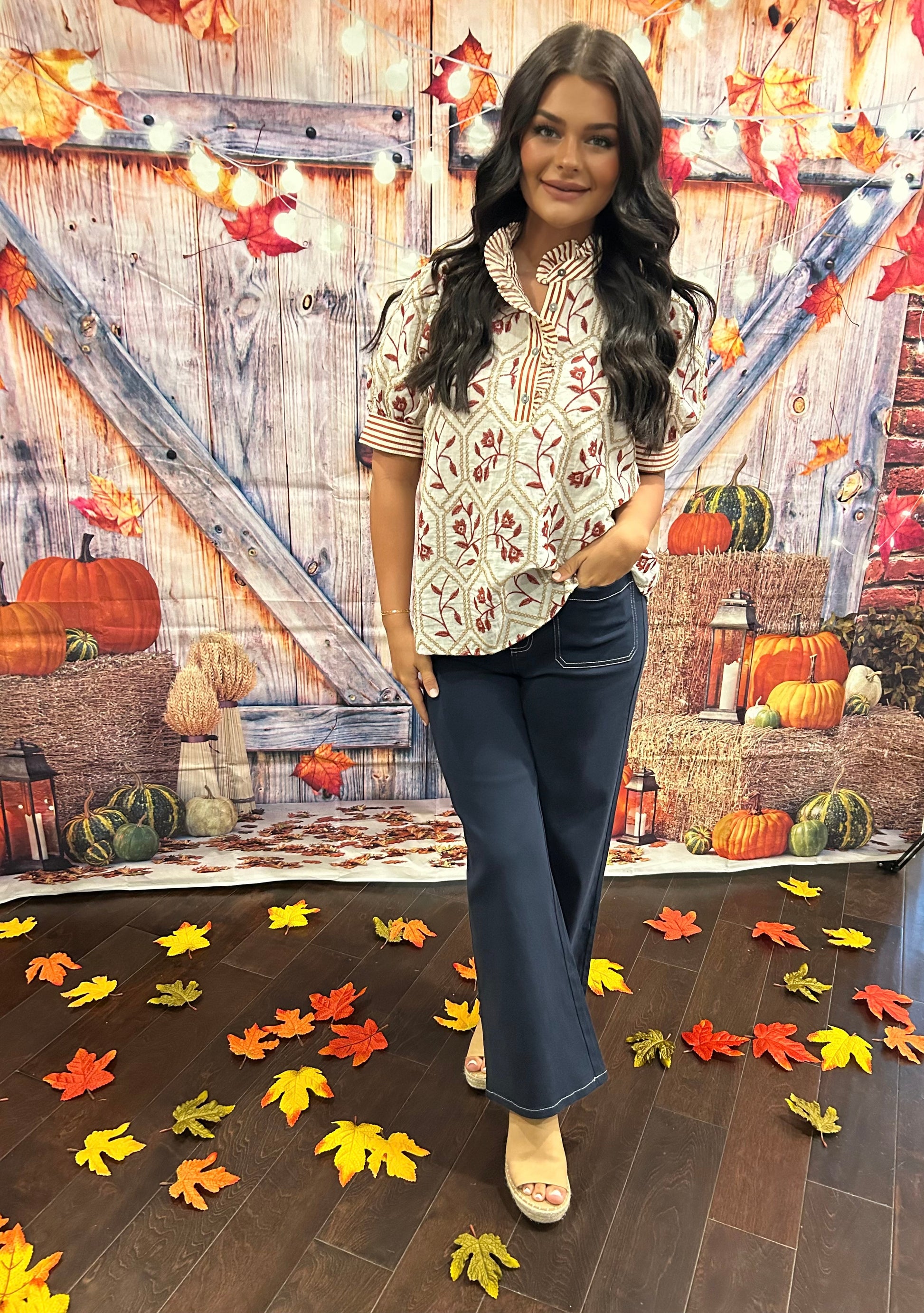 Floral pattern embroidered top featuring striped contrast band short sleeve and front placket button closure. Unlined. Woven. Non-sheer. Lightweight.