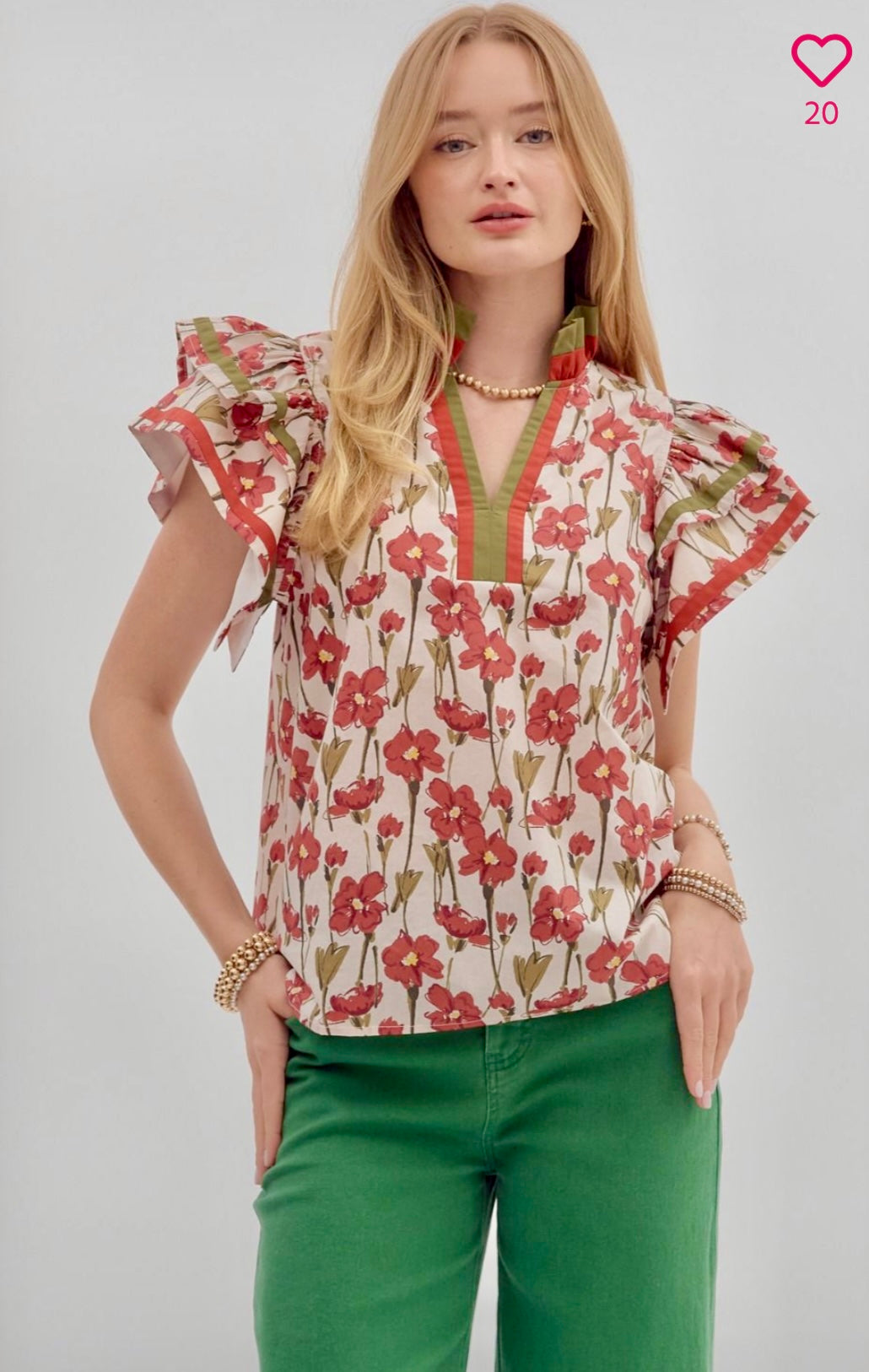 Floral print tiered flutter sleeve pullover top features multicolor accented ruffle neck and sleeve finish. Unlined. Woven. Non-sheer. Lightweight.