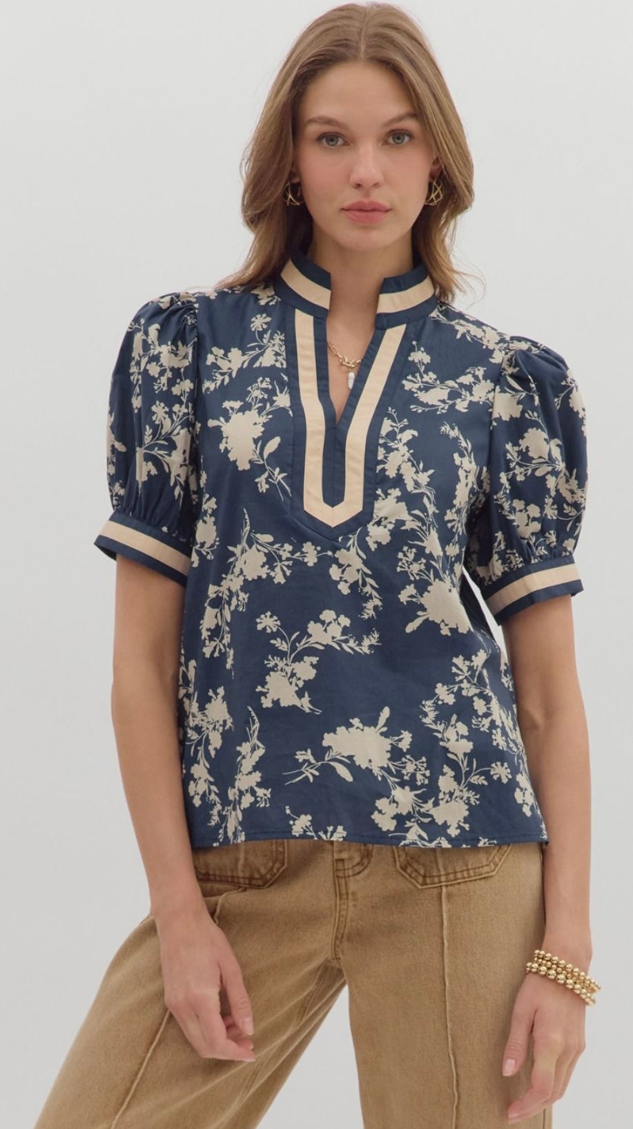 Floral print short puff sleeve top featuring multicolor accent V-neck band collar. Unlined. Woven. Non-sheer. Lightweight.