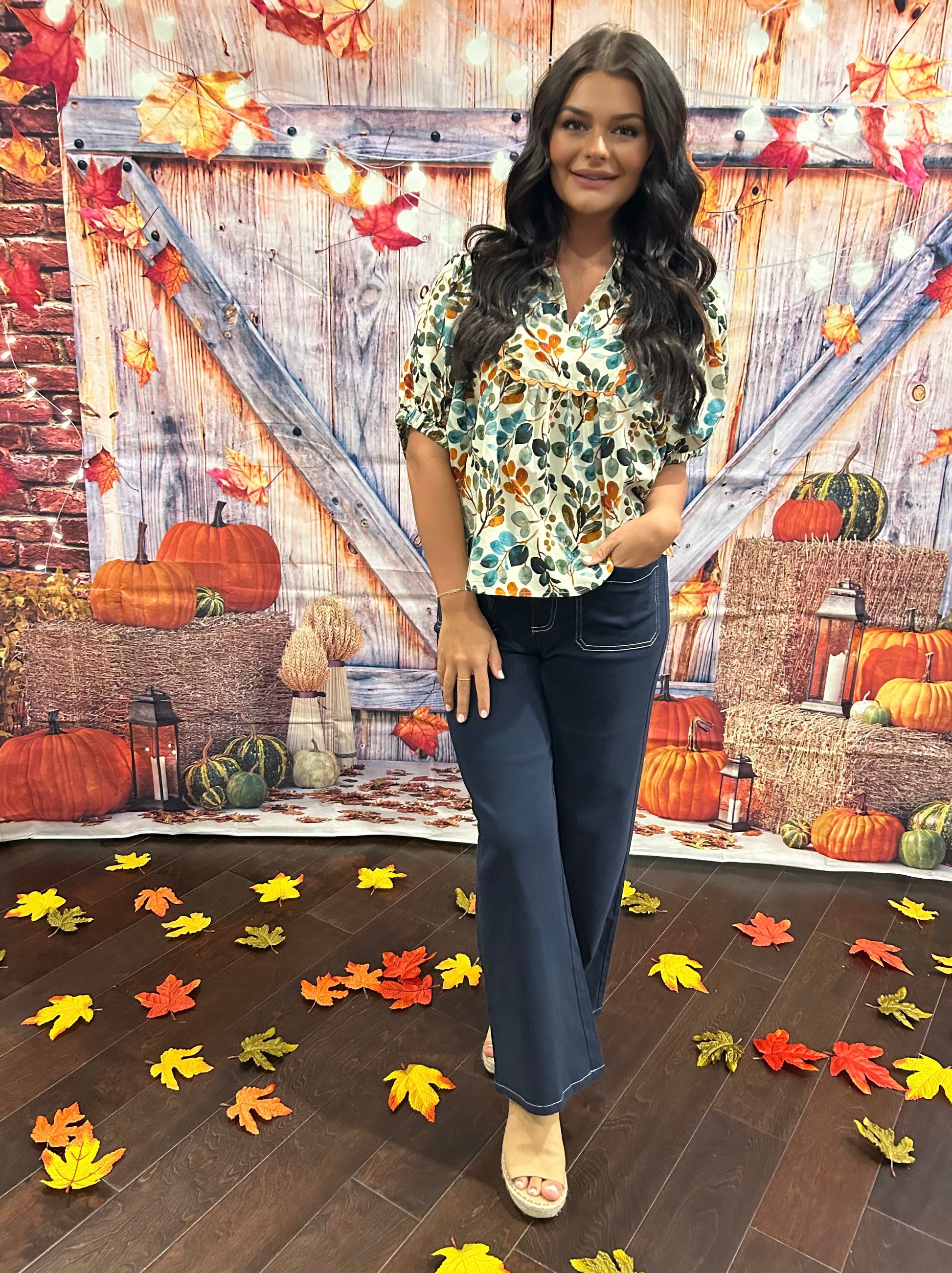 Botanical print V-neck band collar dolman sleeve top featuring contrast scallop trim inset accent. Unlined. Woven. Non-sheer. Lightweight.