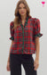 Plaid short puff sleeve top featuring contrast ruffle trim and snap button closure at bust. Unlined. Woven. Non-sheer. Lightweight.